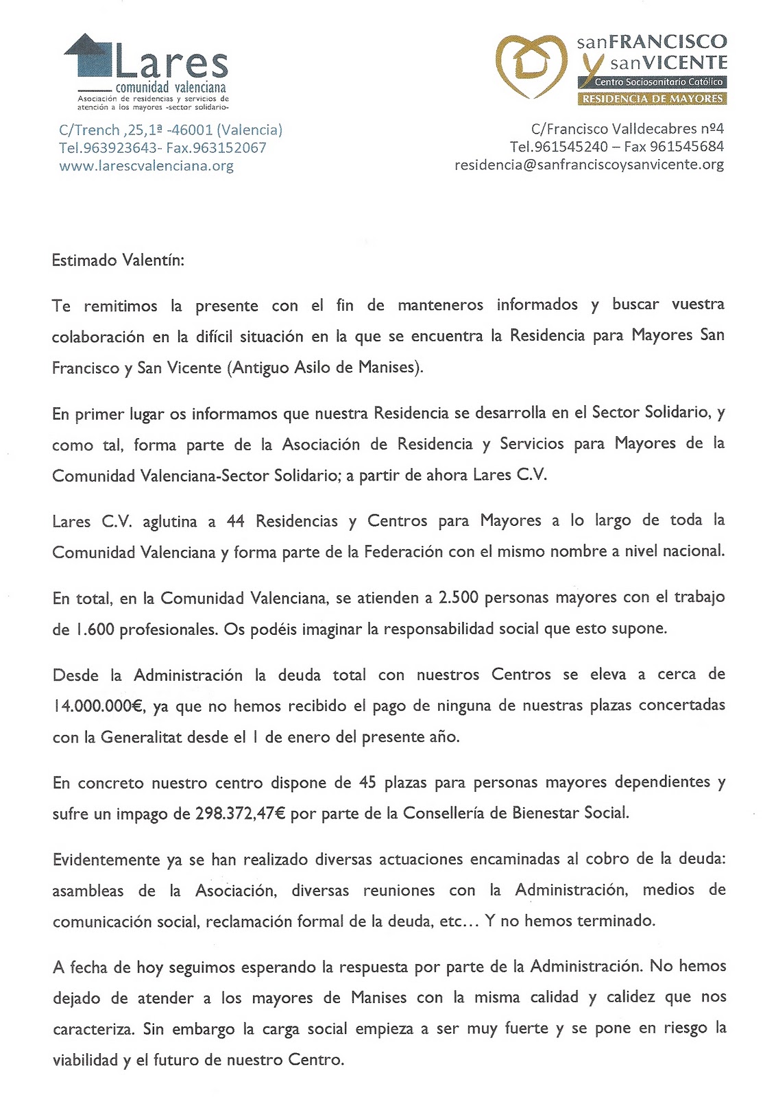 Esta no es la primera -ni será la única- concentración que se realiza, ya que la Residencia forma parte de LARES (Asociación de Residencias y Servicios de atención a los mayores -sector solidario) y en toda la geografía valenciana se están realizando estas convocatorias, ya que la Generalitat Valenciana, por medio de la Conselleria de Bienestar Social, les debe más de 14.000.000 €.