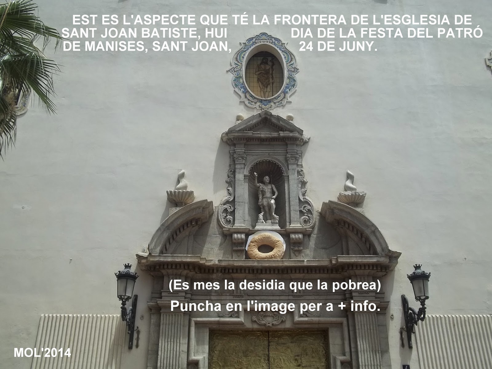 No creo que colocar dos macetones y traer dos «OMS» para colocarlos en la puerta de la parroquia a los pies del Patrono de Manises, y una pequeña mascletà ( 500 €.) a las 2 de la tarde, vayan a desequilibrar el presupuesto del Ayuntamiento de Manises. Más bien creo que a nadie de los que mandan en el consistorio (bueno todos No, a 1 por lo menos sí que se que le importa), se preocupa de estos pequeños detalles, que al fin y al cabo lo que hacen es honrar a un Santo que es nuestro Patrón.