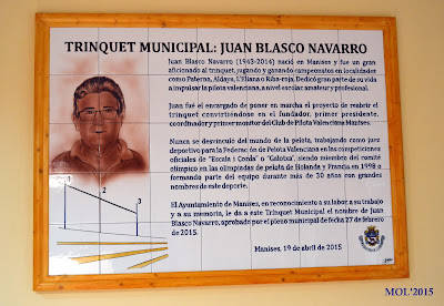 Han pasado dos años desde que se colocara la placa en la entrada al Trinquet, y que pueden ver en este artículo, y aunque yo particularmente he solicitado, en más de una ocasión, que se rotulara el nombre en la fachada, en azulejos acorde con los que están, guardando la línea en la decoración, hasta la fecha no ha sido así.