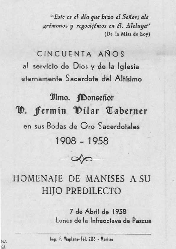 - El 7 de abril de 1958 celebra en Manises las Bodas de Oro sacerdotales.