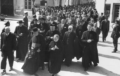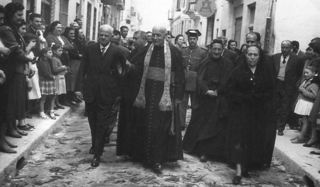 En las Bodas de Oro Sacerdotales el 02.04.1958. Por las calles de Manises acompañado por autoridades eclesiásticas y civiles. Podemos ver a su izquierda a Don Joaquín Montes Mollá, sacerdote.