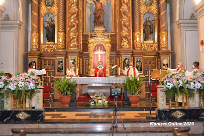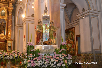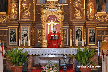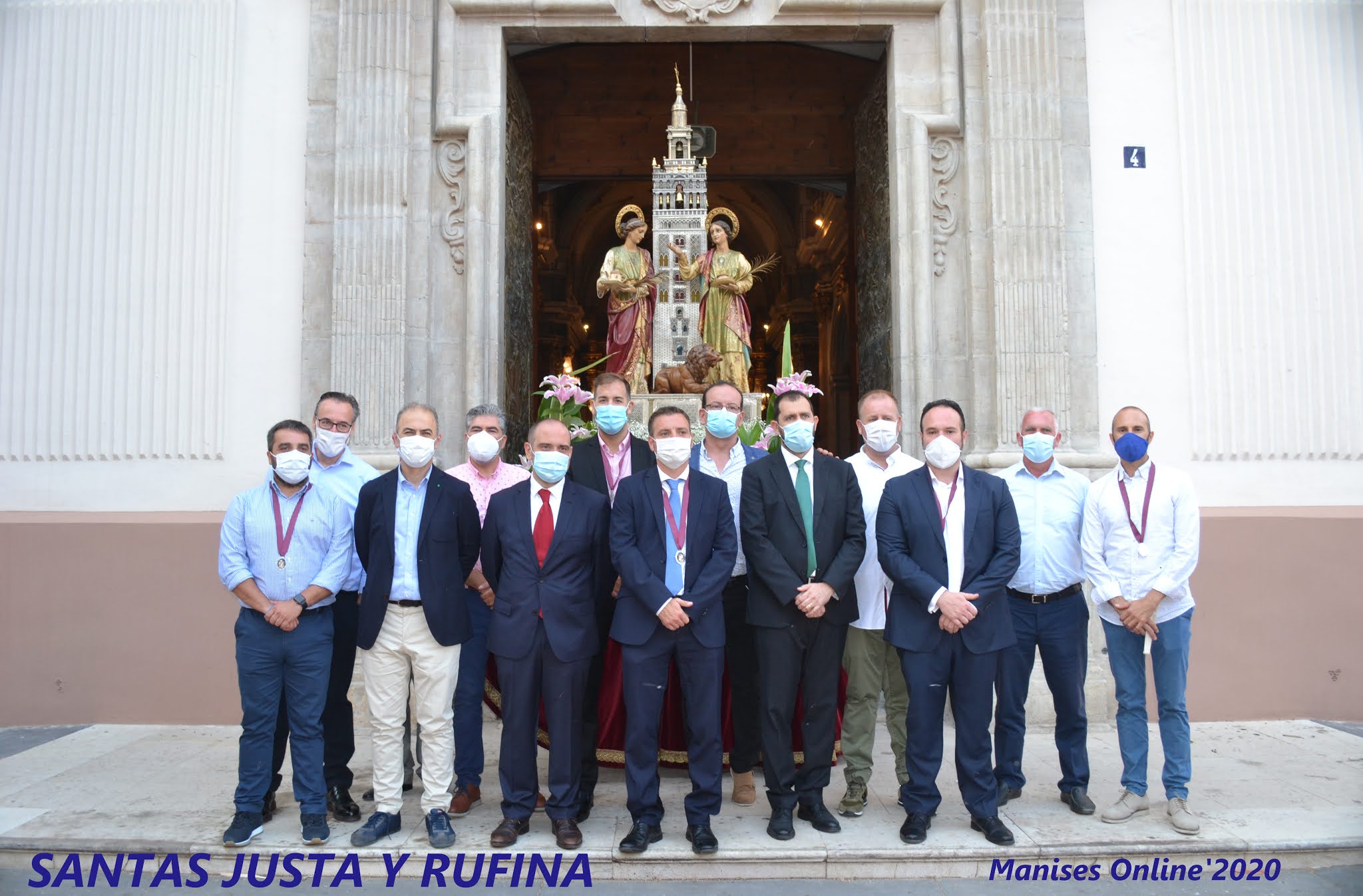 Al finalizar los cantos e himnos, que durante toda la misa nos han acompañado desde el coro, los clavarios han sacado el anda con las Santas a la puerta de la iglesia, con el fin de ofrecerlas a los feligreses que no habían podido entrar en el templo y a toda Manises.