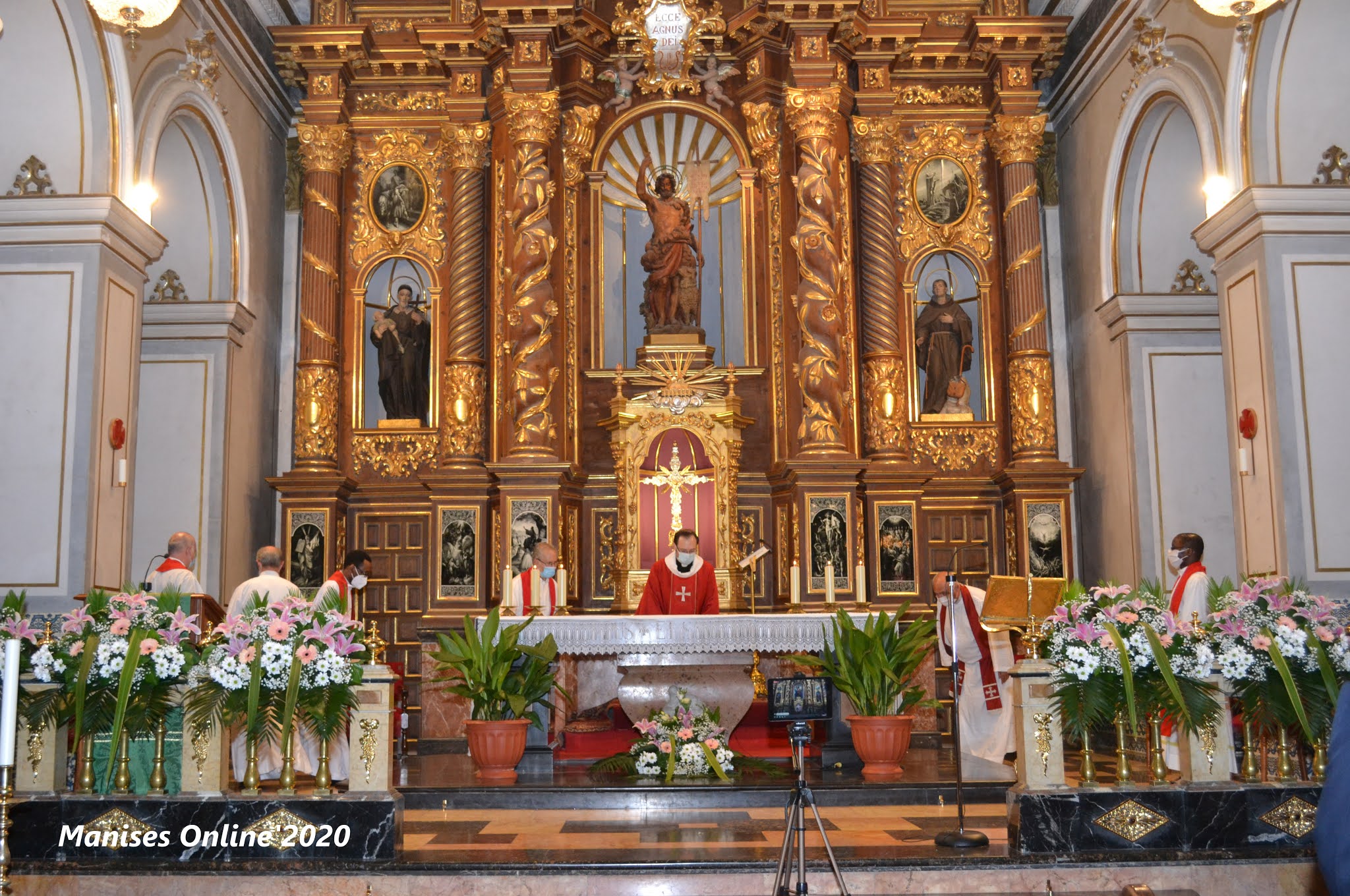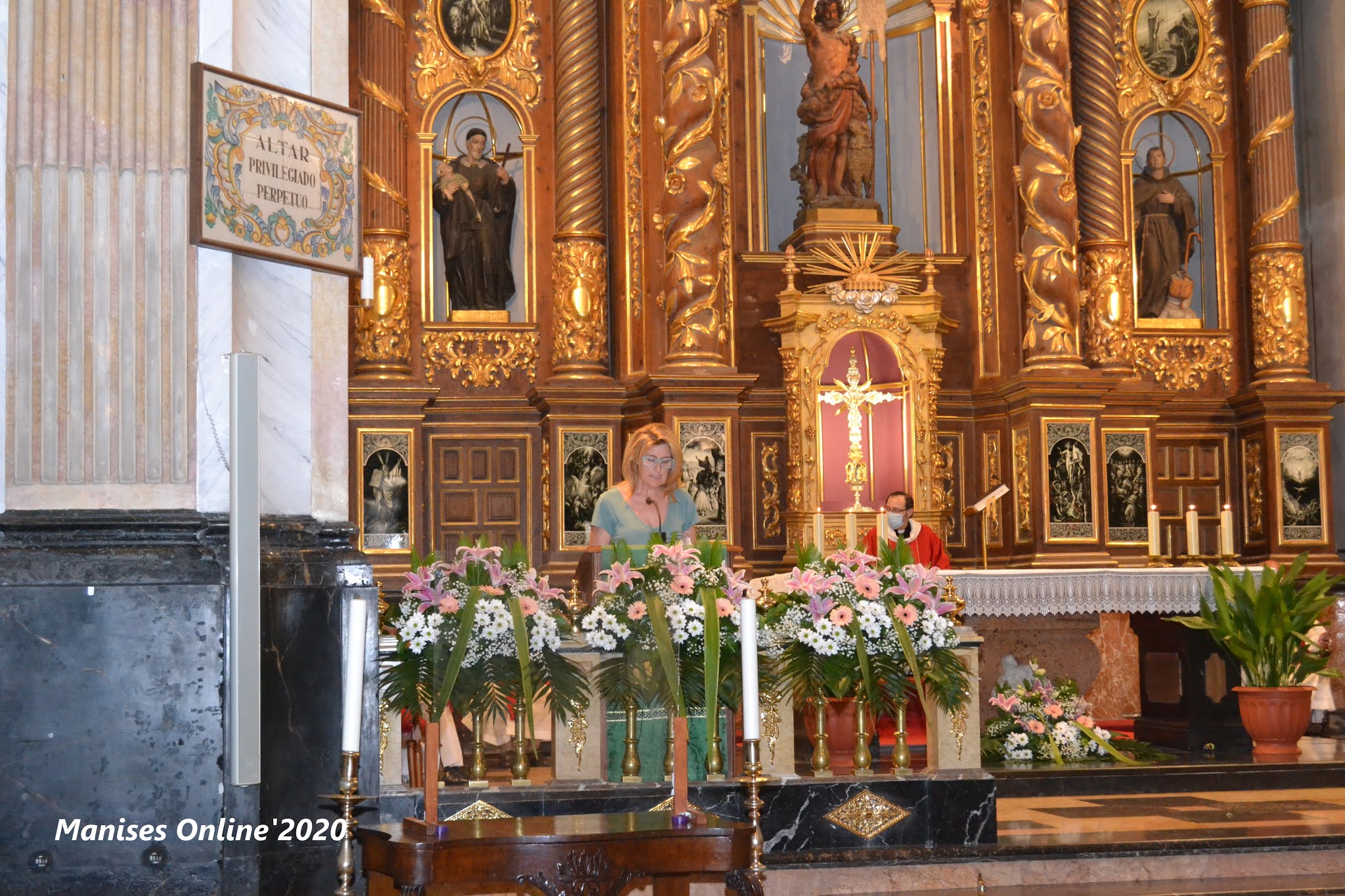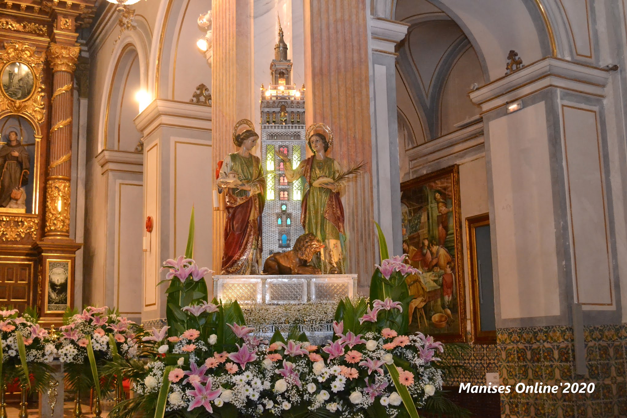 Aspecto que presentaba el altar mayor de la parroquia de san Juan Bautista el pasado 19 de julio, fiesta a la Patronas de la Cerámica y de Manises, que este año ha tenido una celebración muy especial, debido a las restricciones sanitarias, con motivo del Coronavirus que nos azota.