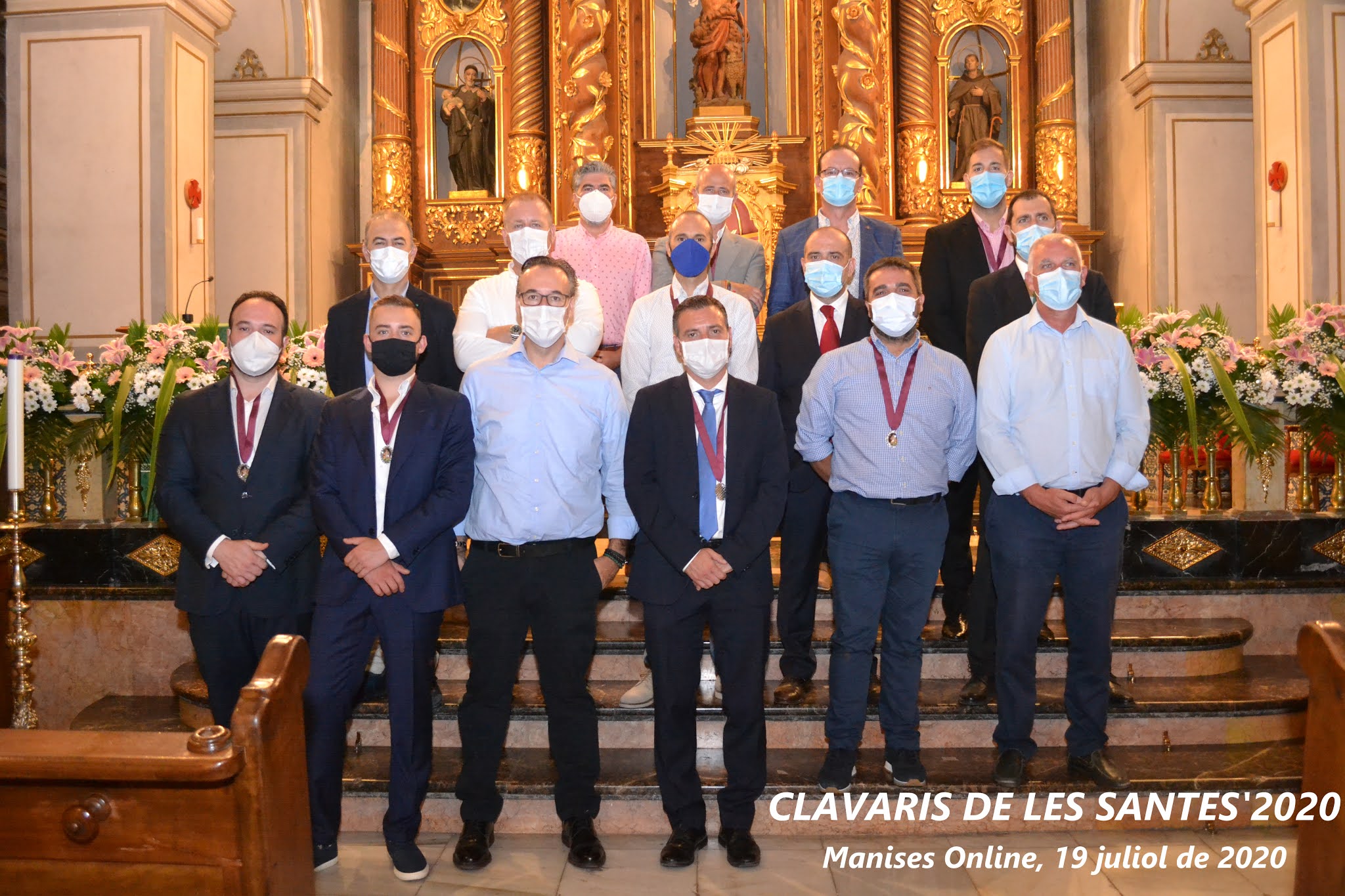Una vez finalizada la Santa Misa los Clavarios se han fotografiado a los pies del Altar Mayor, junto a la imagen de las Santas que estaban a su izquierda, engalanadas y con las luces encendidas.