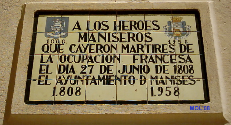 El pasado 3 de Noviembre hizo 270 años del nacimiento de este Alcalde manisero, que fue asesinado por los franceses. Esta es la transcripción exacta de lo que José Mª Moreno reseñó en su libro de 1983. Lo que le ha faltado añadir es que de él partió la iniciativa para que en 1958 se colocase el mural de azulejos en la fachada de la Parroquia de San Juan Bautista, recordando la fecha de los asesinatos del 27 de Junio de 1808, ya que –según los documentos de las actas de los plenos, recogidas en el Boletín de Información de Manises- así consta.