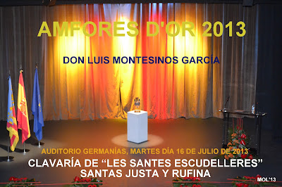 En el Auditorio Germanías de Manises, ha tenido lugar la entrega del máximo galardón que la fiesta a las Patronas de la Cerámica y de Manises -SANTAS JUSTA Y RUFINA-, por parte de los Clavarios a Don Luis Alejandro Montesinos García.