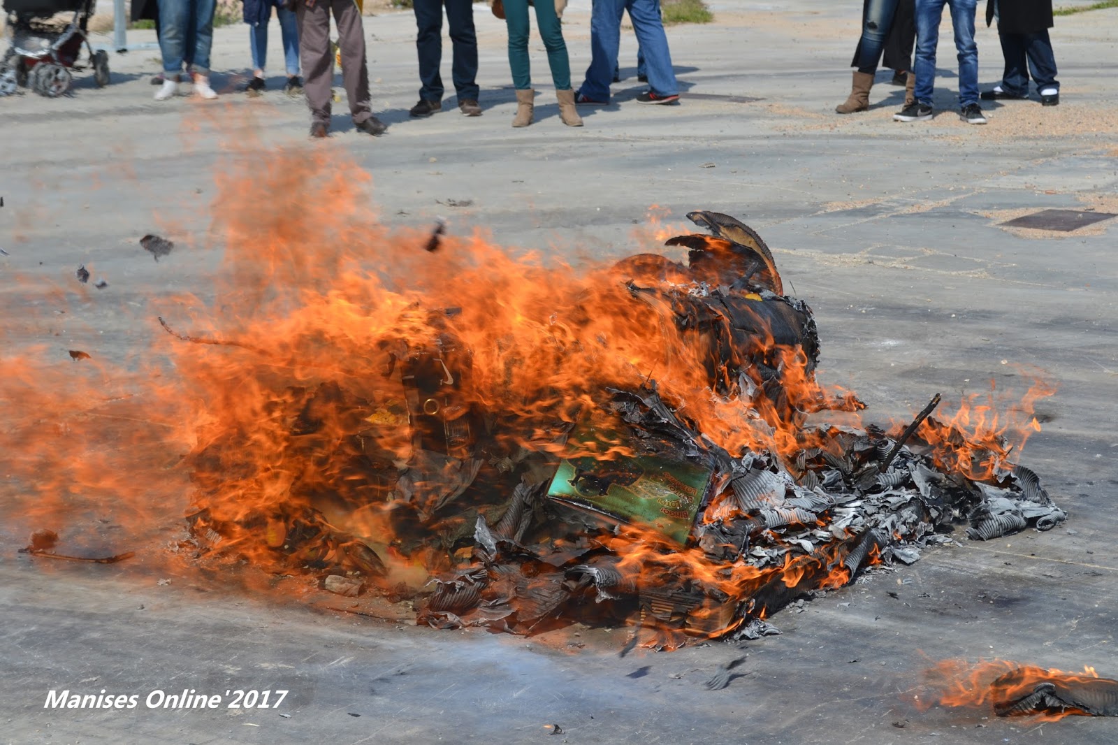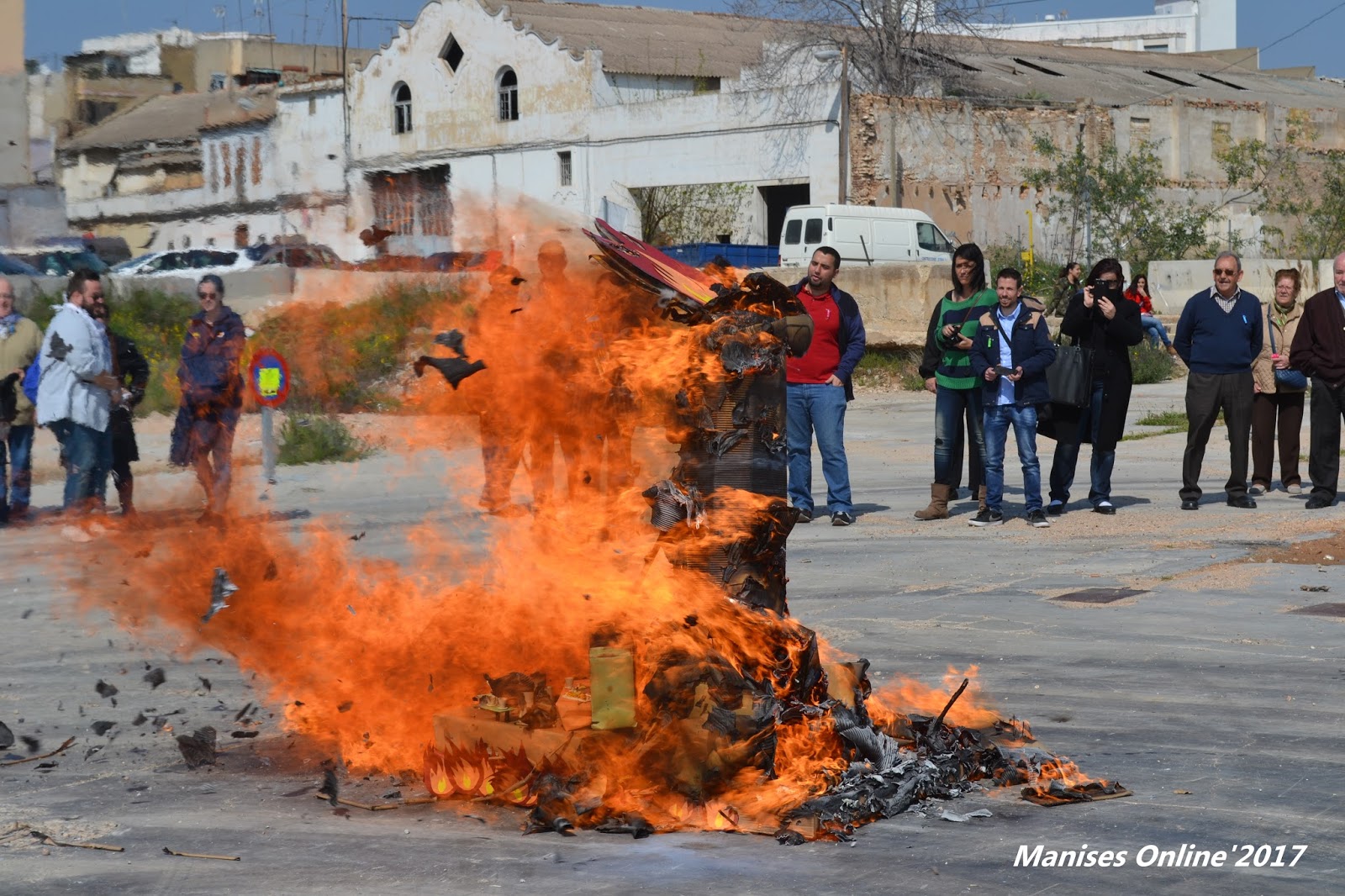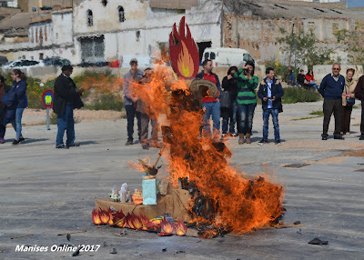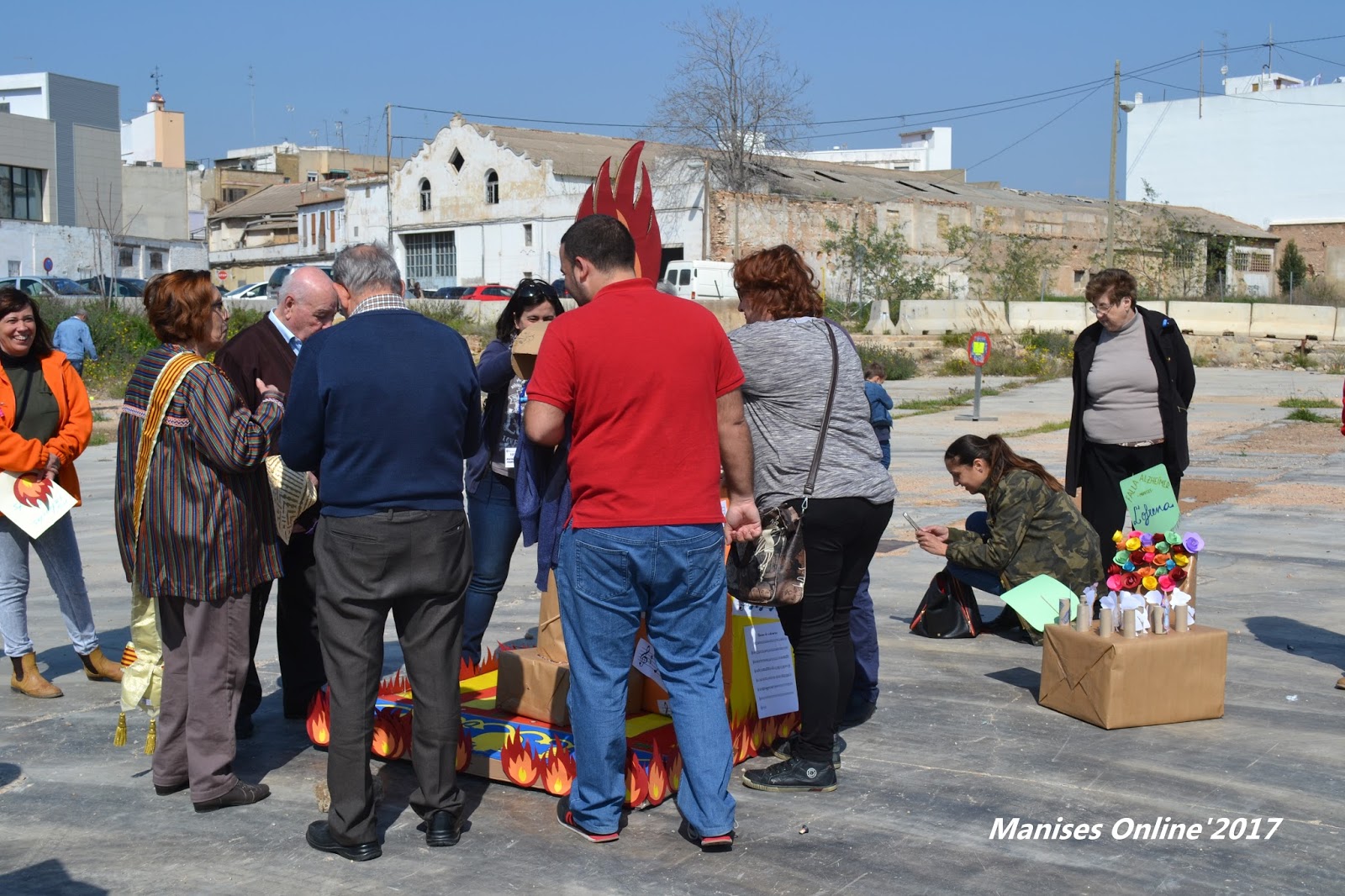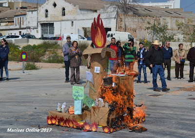 Reunidos en el Parc d’Els Filtres de Manises, y después de desayunar una buena taza de chocolate, se ha procedido al desfile con las flores que se han depositado en el altar que allí se encontraba, y una vez tomadas las fotos de familia, han esperado a Protección Civil para poder quemar la falla que han llevado del parque -desde estaba guardada- a la explanada del solar donde antiguamente estaba la firma de azulejos de Olmos.