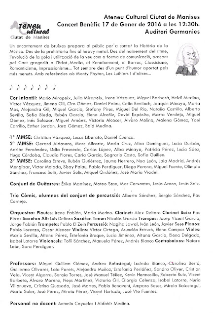 El pasado domingo 17 de Enero, a las 12:30 horas, tuvo lugar en el Auditorio Germanías del Concierto Benéfico que la asociación ATENEU CULTURAL CIUTAT DE MANISES, ofreció con el fin de recaudar fondos para ayuda a los necesitados.