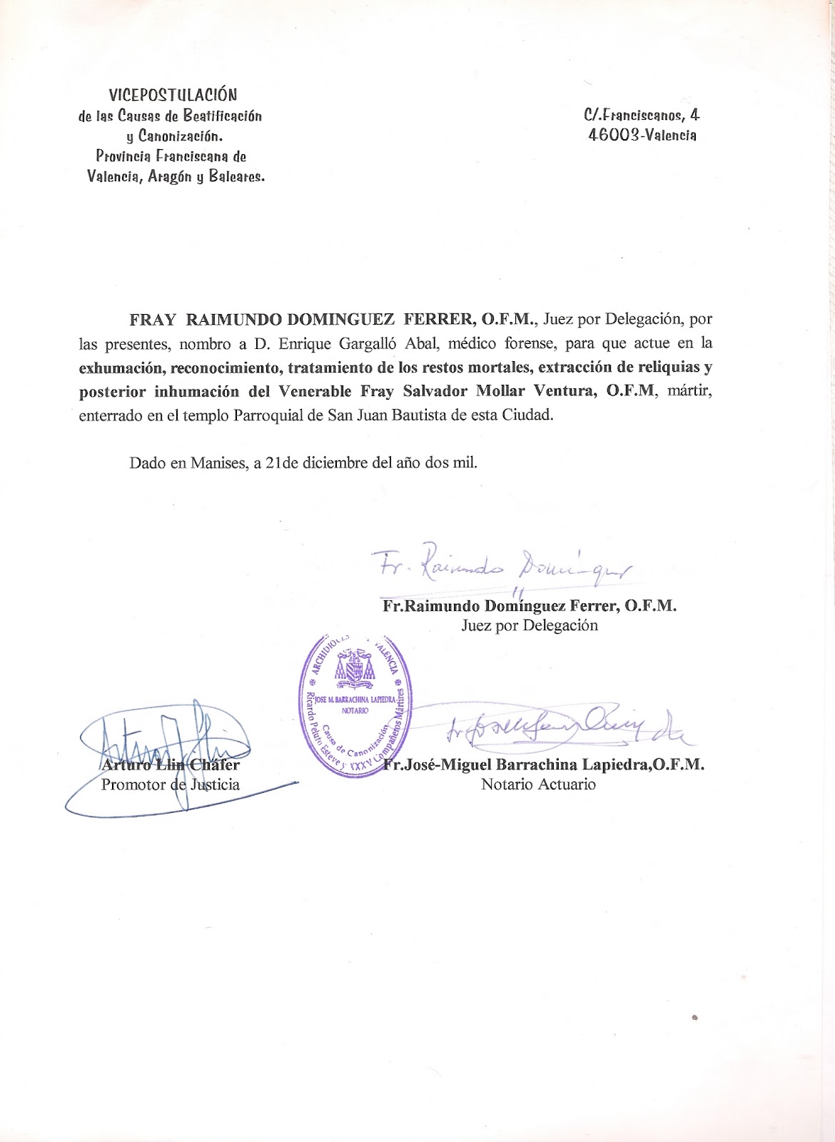 Posteriormente -en Diciembre del año 2000- se le encarga al Dr. Don Enrique Gargallo Abal que se encargue de efectuar la exhumación, reconocimiento, tratamiento e inhumación de los restos que estaban en el templo parroquial.