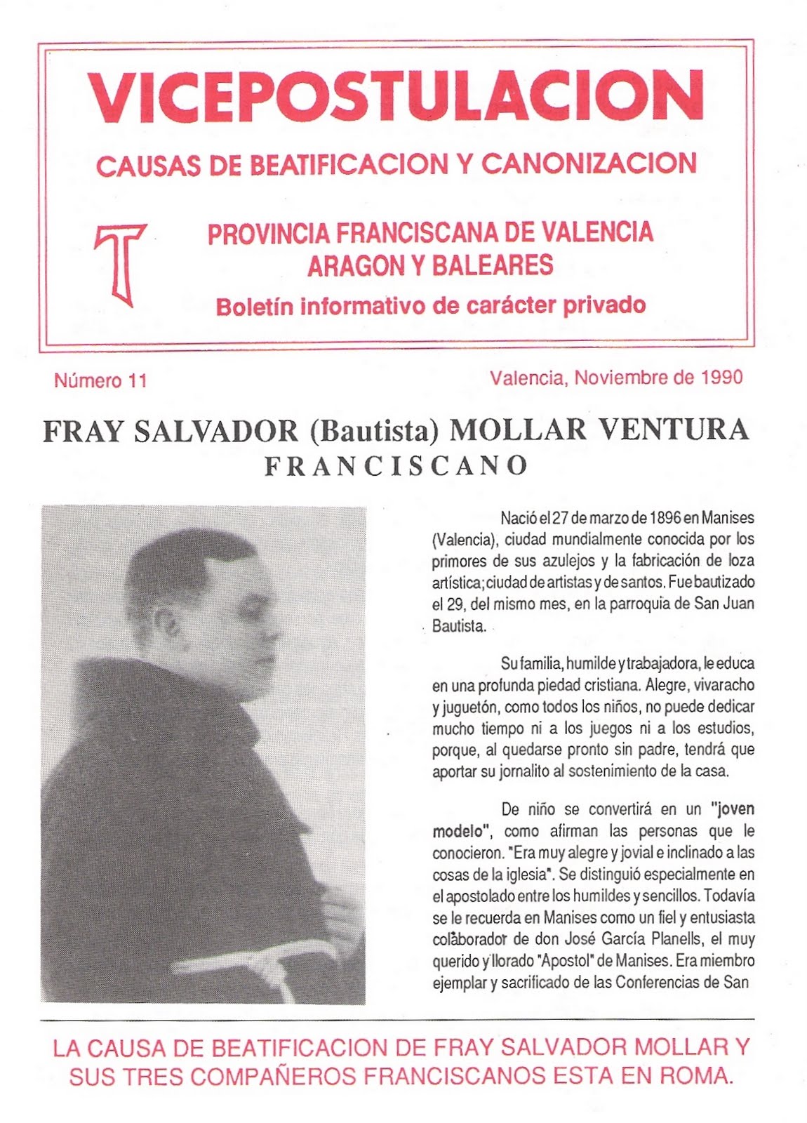 El 27 de marzo de 1896 nació en Manises, pueblo que dista unos 6 Km de Valencia, próspero por la industria de la cerámica, de fama internacional, el cuarto de los siete hijos que tuvieron Bautista Mollar y María Ventura, esposos que, procedentes de Bechí (Castellón), habían llegado al pueblo en busca de trabajo para mejorar sus condiciones de vida. Formaban un hogar de gente pobre y trabajadora, a la vez que humilde y sencilla, honrada y cristiana. Dos días después de su nacimiento, bautizaron a su hijo en la parroquial de San Juan Bautista, y le llamaron como a su padre. Dada la situación económica familiar, Bautista estudió sólo la enseñanza primaria en las escuelas nacionales del pueblo, y muy pronto tuvo que empezar a trabajar a fin de ayudar a los suyos. El tiempo libre que le dejaba el trabajo lo dedicaba a la piedad y al apostolado entre los niños de los barrios pobres.