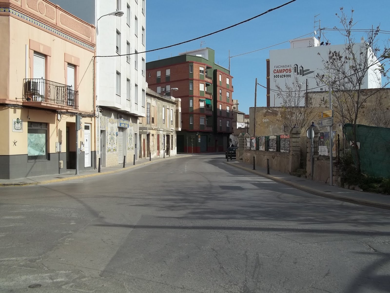 Termina o empieza, la calle de Valencia. A la derecha lo que antes era el Edificio de la Arriba. Hoy derruido. Llegado a este punto a la izquierda (mirando la foto) dirección a Paterna. A la derecha entrada a Manises.