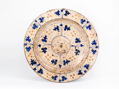 Las seis nuevas piezas ingresadas en el Museo y que se presentarán al público a partir de noviembre, son representativas de las producciones de finales del siglo XIV o primeros años del siglo XV. La más antigua de ellas es un gran plato con motivos inspirados en las afamadas lozas de Málaga, que presenta decoración con un tema llamado “orla de peces” (nº 1). El inicio de producción de esta serie debe situarse entre 1370/80, cuando platos con esta decoración fueron colocados como ornato en la fachada de la romana basílica de Santa María la Maggiore, y su final hacia la tercera década del siglo XV. Otros dos platos muestran una decoración floral con rosas góticas en relieve (nº 2) y flores de puntos (nº 3), temas que se inspiraron en las raras porcelanas o las sedas chinas de los primeros Ming que llegaban a Europa por la ruta de la seda. De hecho esas rosas góticas presentan un extraordinario parecido con las peonías que empezaron a pintarse en las porcelanas del periodo Hongwu, algo anteriores. Fragmentos de estas series han sido encontrados abundantemente en las excavaciones de Manises , también entre los restos que rellenaban el foso del castillo de Dordrecht (Holanda), destruido en 1410, y aparecen también representadas en la pintura gótica de su tiempo, como en la predela de la Santa Cena de Solsona del maestro Jaume Ferrer. Esas flores de puntos decoran un gran plato con el escudo de Felipe el Bueno de Borgoña que debe fecharse entre 1416 y 1428 y acompañan generalmente otros temas, como los epigráficos góticos “AVE MARIA”, de los que hemos encontrado en Manises platos desechados unidos por fallos de cocción, o el motivo de “la corona”, visible en el plato más representativo de la serie hasta el momento conservado en el Museo Nacional de Cerámica en el que el tema se une al heráldico de las barras de Aragón. De la misma época son los fragmentos de la serie de la flor de nuez moscada o “brionia”, también aparecidos en nuestra excavación.
