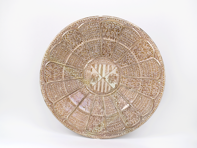 Dos platos pertenecen a las producciones del tercer cuarto del siglo XV, uno de ellos portador de un escudo que representa a un toro –una posible alusión al emblema heráldico de los Boil (nº 4), señores de Manises y detentadores de los derechos de la producción de loza dorada-. La decoración de esta pieza muestra una retícula geométrica en dorado con rosas azules diseminadas por su superficie, en todo semejantes a algunas halladas en las excavaciones que recientemente hemos practicado en Manises . Esa misma decoración se encuentra en la tabla de la Virgen y el Niño de Juan García Benabarre (activo entre 1449 y 1476) en la que vemos una fuente con frutos servida por un ángel en la que destacan claramente las rosas góticas. Su reverso exhibe el excepcional dibujo de un ciervo de gran calidad (nº 5), que sólo era visible cuando la pieza se colgaba del muro tras su uso. La decoración de un segundo plato se preside por un escudo partido con el emblema de los Centelles en el jefe y con tres lises sobre un tupido fondo con el tema llamado de “hoja de hiedra” (nº 6). Para fechar esta decoración conocemos otros platos similares de Manises con la heráldica del rey Juan II y Blanca de Navarra, o jarros con el escudo de Piero el Gotoso Médici, posteriores a 1466, o del abad de Poblet Miguel Delgado (1458-1478).