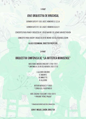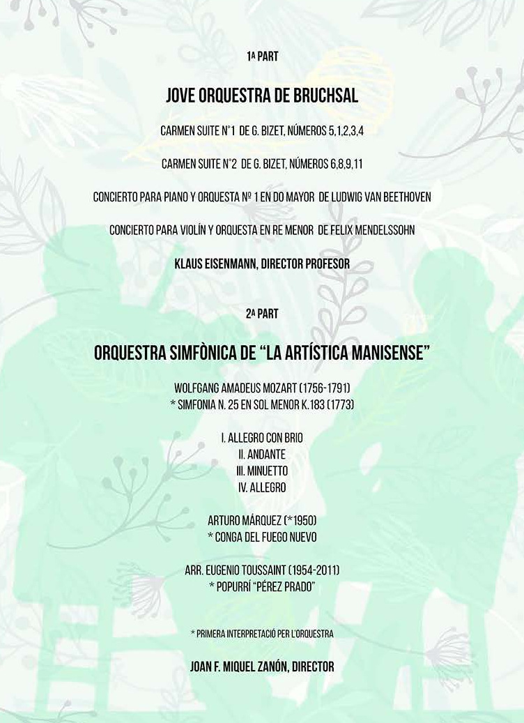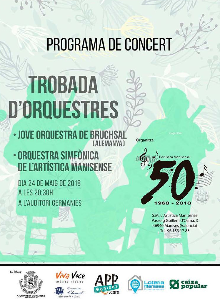 El Jueves día 24 tendrá lugar un concierto entre la Orquesta de Bruchsal (Alemania) con nuestra Artística Manisense, con el pograma que se indica arriba.