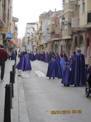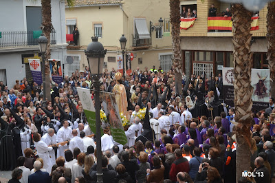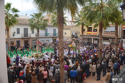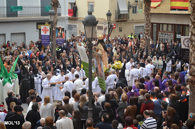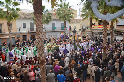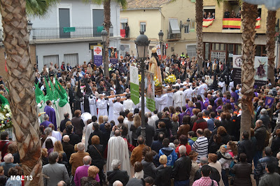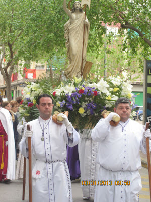 Desde muy pronto (11:00 horas) la Plaza de la Iglesia se ha ido llenado de gente que no quería perderse el Tradicional acto en el que se reencuentran Jesús y su Madre. La plaza a las 11:30 h., hora en que han aparecido las dos procesiones, estaba llena y ha entrado en primer lugar el Resucitado, que se ha colocado a la entrada de la Iglesia, de espaldas a la puerta. Posteriormente ha subido a la Plaza la Virgen tapada por el manto negro en señal de duelo, y que más tarde -siguiendo el ritual- se le ha retirado, con las muestras típicas de alegría y fiesta que con anterioridad Don Valentín (acompañado por Don Juan), desde un balcón nos felicitaba las Pascuas y nos deseaba una feliz día, comiéndonos la tradicional Mona de Pasqua.