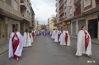 La procesión que llevaba la imagen de la Virgen, y a la cual acompañaban las Hermandades de la Esperanza y de la Soledad, ha seguido el itinerario: Parroquia de San Juan Bautista, Calle Mayor, Doctor Gargallo, San Vicente, Doctor Catalá, Plaça del Castell, Sagrari, Obispo Soler, Mayor, hasta la Plaza de la Iglesia, por lo que las dos procesiones se han encontrado en la Plaza de la Iglesia, viniendo las dos por la calle Mayor.