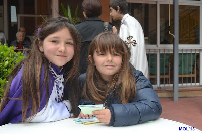 Haciendo entrega a las Hermanas y a los Mayores de las cajas con las Monas de Pascua.