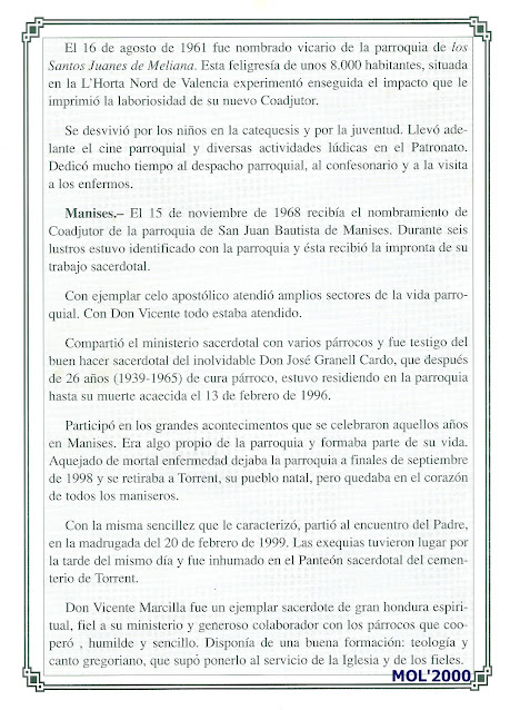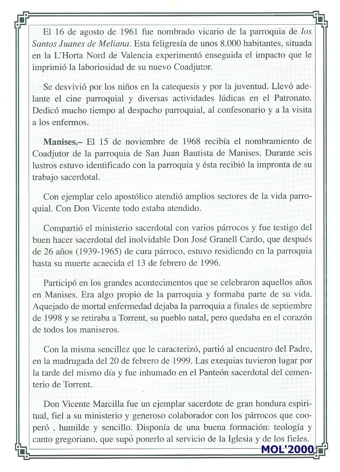 Plasmar la vida de Don Vicent, un Maniser Ilustre -que aunque nacido en Torrent estuvo 30 años como Coadjutor en la Parroquia de Sant Joan Batiste– es una labor que está llevando tiempo ya que participó en muchas actividades de la Vida Social en Nuestra Ciudad.