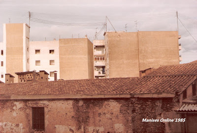 Foto tomada desde tierra y en la que se puede ver las edificaciones -todavía en pie- que se encontraban en el solar. Al fondo las fincas que rodeaban y rodean el solar. Año 1985. Foto Pepe Esteve.