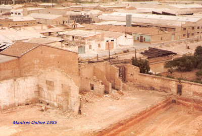 Vista parcial de solar, la parte que recae a lo que hoy es la Avgda. de la GeneralitatValenciana, que entonces no existía, ya que por allí sólo estaban los raíles de la vía del tren y un camino junto a las vías, que servía para pasar. Al fondo y a la derecha se pueden ver las travesses (vigas de madera para los raíles del tren) y las naves existentes con la Calle Torrente en el centro. Año 1985. Foto Pepe Esteve.