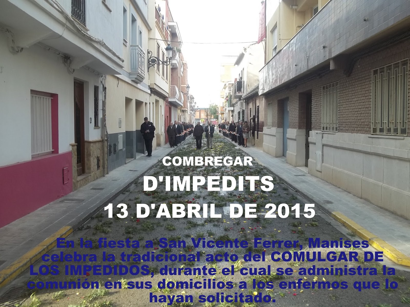 El Combregar d’Impedits ha salido por la calles de la demarcación de nuestra parroquia a los 6 enfermos que este año se habían registrado en las oficinas. Su salida -después de la Misa oficiada por el Cura Párroco de San Juan Bautista Don Pablo Tos Real- ha comenzado a las 8:35 h. y ha terminada a las 10:30 horas de la mañana.