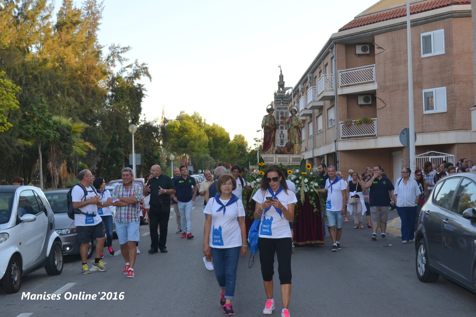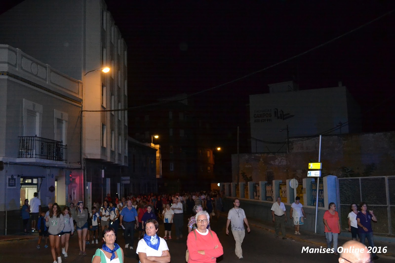 Después de unos minutos para reponer fuerzas y tomar un pequeño aperitivo, la comitiva salió por la Calle Mayor, con destino a la salida de la Ciudad de Manises, pasando por la Parroquia del Inmaculado Corazón de Jesús, en la calle del Dr. Fleming, seguimos por la Calle de l’Olivereta (llamada así, porque anteriormente era en estos terrenos donde se ubicaba del campo de fútbol de la U.D. Manises LA OLIVERETA), hasta desembocar en la calle de Santos Justo y Pastor, donde a la salida está situado la antigua caseta de los «peones camineros», de Renfe y que hace muchos años no tiene utilidad.