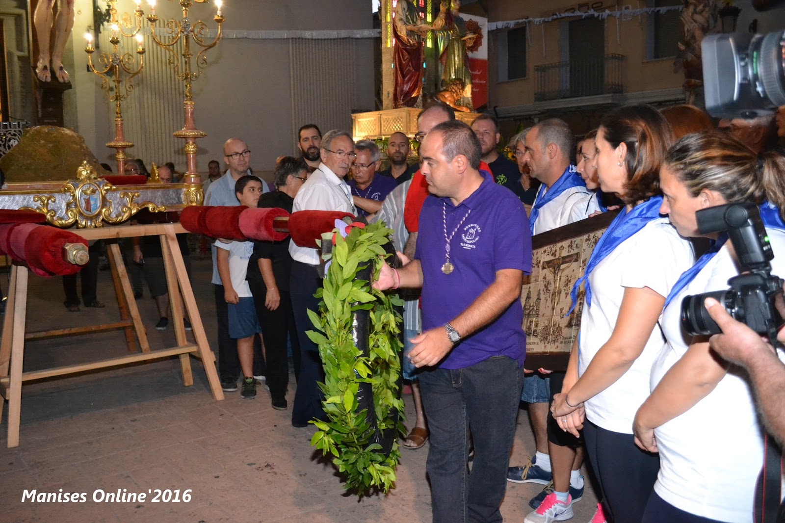 El Cristo hizo su entrada y se colocó al lado de Les Santes y en nombre de todas las Hermandades el Presidente de la Hermandad del Santo Sepulcro «EL MORATS», le hizo entrega de una corona de laurel.