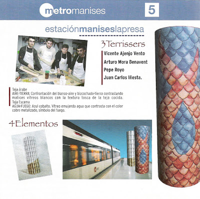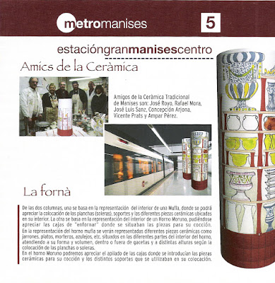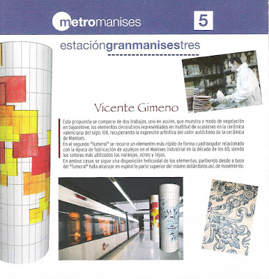 Después de hacer esta salvedad o introducción a lo que ha sido la llegada del Metro a Manises, lo que por otra parte ha supuesto un gran avance y desarrollo social, al mismo tiempo que ha cambiado la fisonomía de Nuestra Ciudad, se empezaron a solicitar propuestas y proyectos, a ceramistas de Manises, en muy poco tiempo, para que aportaran ideas para las diversas paradas que el Metro iba a tener en Manises, ya que existía un partida presupuestada -dentro del importe para la ornamentación del Metro- que era preciso cubrir.