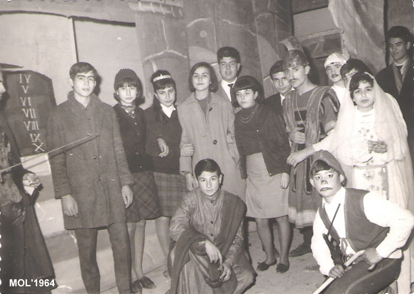 En esta fotografía, que nos hicimos los amigos en el año 1964, en el Teatro Patronato, cuando representamos el Belén, lo vemos a la derecha, arriba, observándonos.
