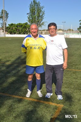 Juan Blasco Navarro (Tales, como era muy conocido en Manises, sobre todo en el fútbol), en una fotografía de 2013, en el Polideportivo Municipal campo Vicente Martínez, cuando conmemoramos el 50 aniversario de la fundación de la Peña Deportiva LOS HALCONES. A su derecha Rafael Cones Betoret.