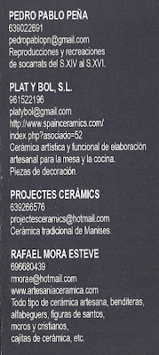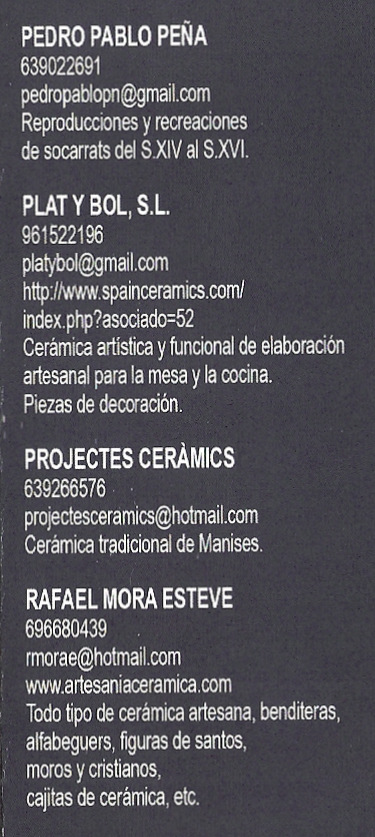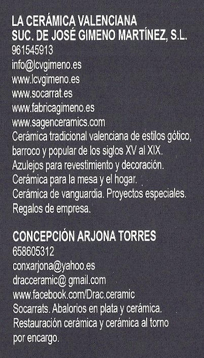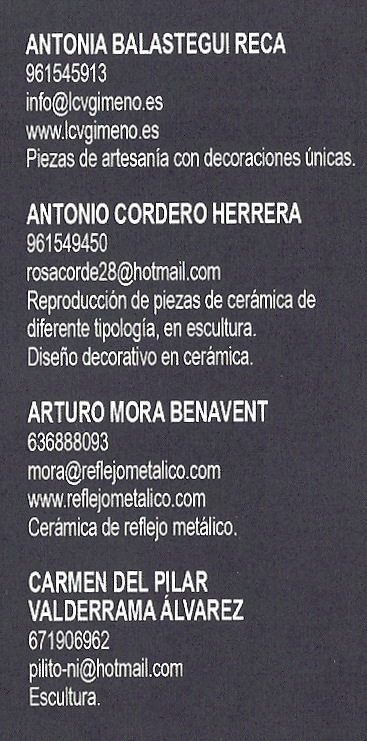 Este año la exposición se celebra en el edificio EL ARTE, y en la sala donde se ubican sus cerámicas están expuestas las cerámicas de los artesanos que a continuación se indican. Junto a su nombre se encuentra su teléfono de contacto, así como su correo electrónico o web por si se desea más información sobre ellos.