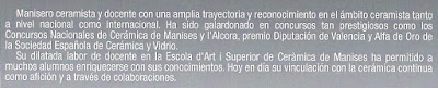 Como viene siendo habitual en estos últimos años, aprovechando la exposición que los ceramistas han preparado con motivo de las Fiestas Patronales, se ha efectuado un homenaje a un manisero con una amplia trayectoria en el mundo de la cerámica.
