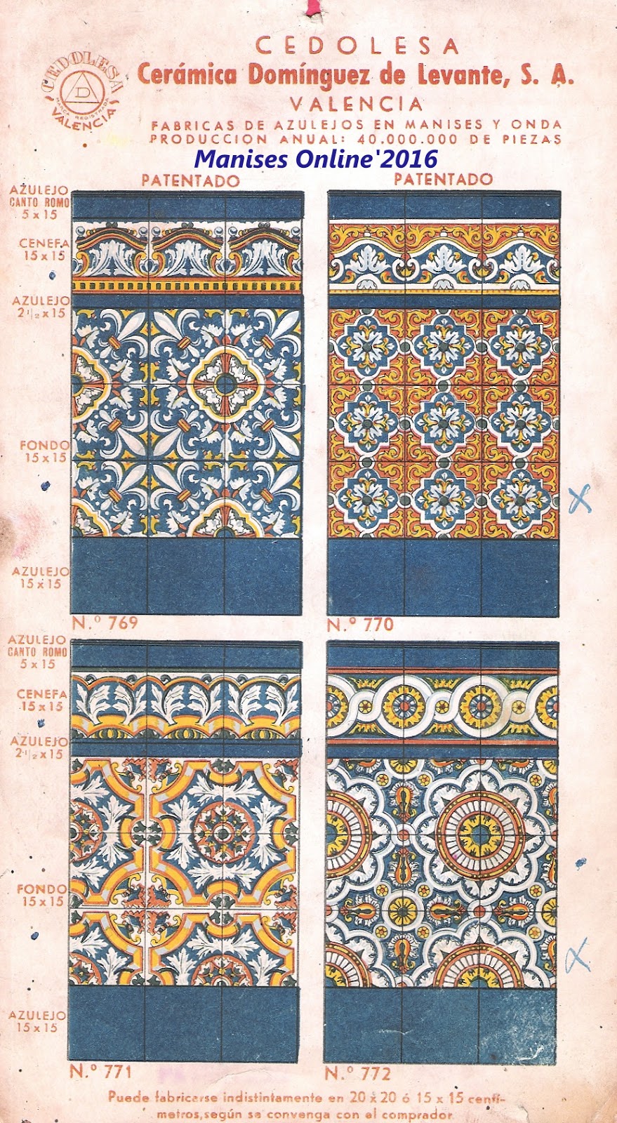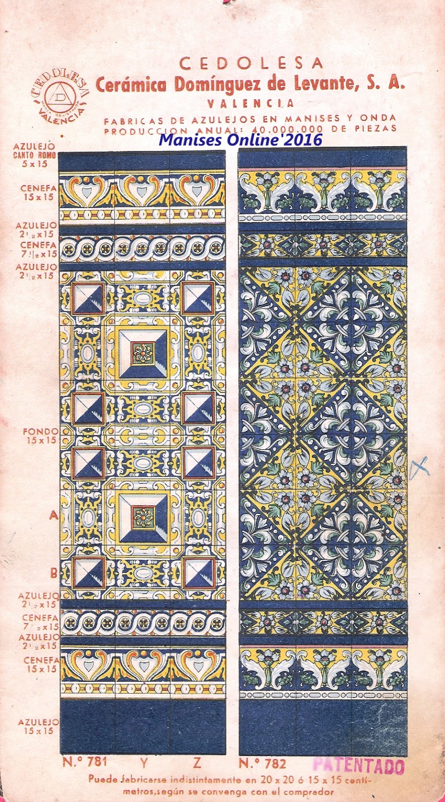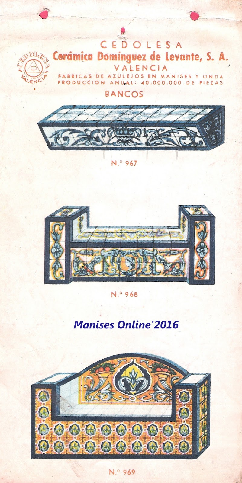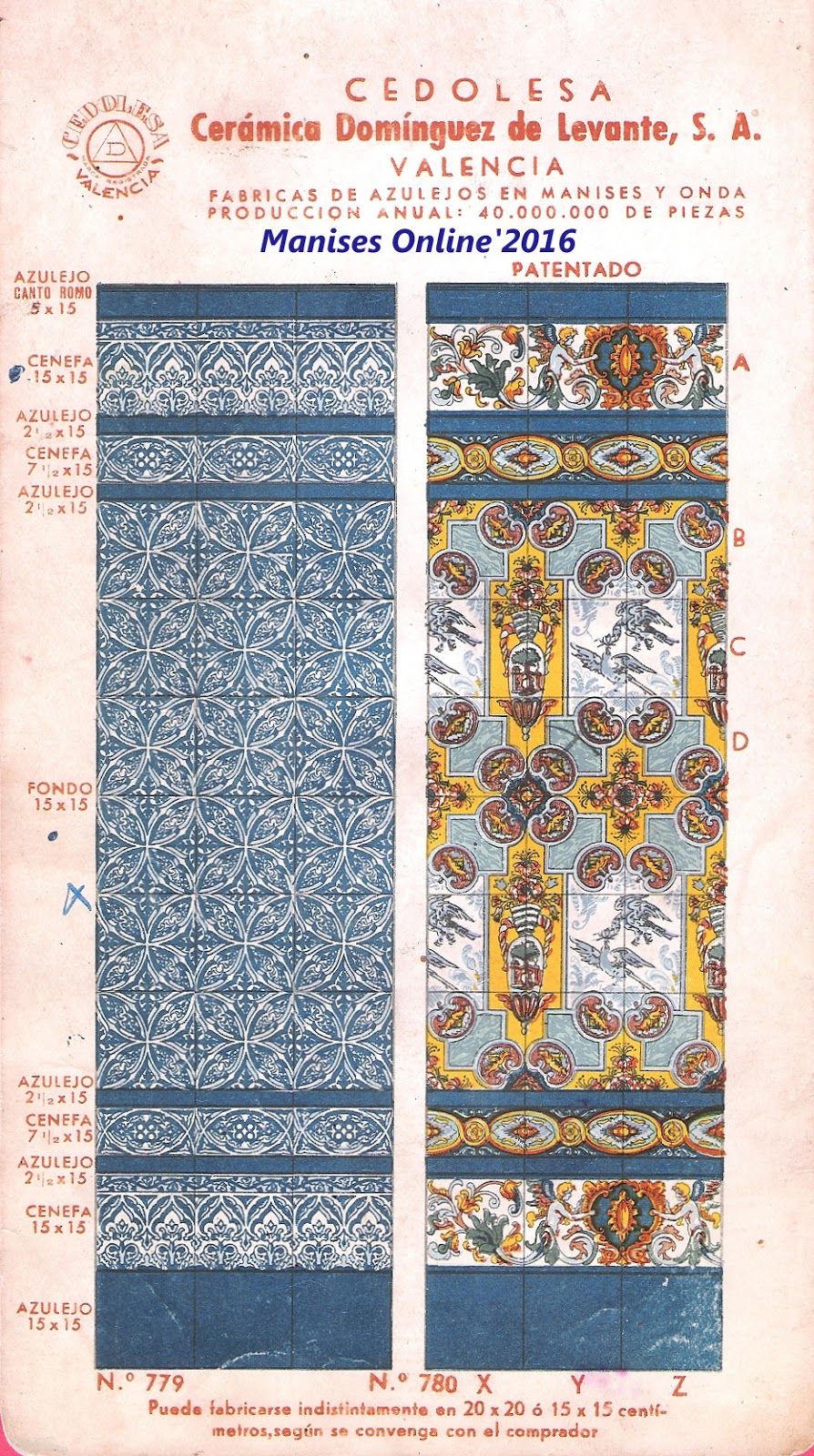 En este catálogo publicado posteriormente nos encontramos con una visión distinta, ya que en sus láminas se especifica que -además de las fábricas de Manises y Onda- se incluye que se fabrican 40.000.000 millones de piezas, es decir 20 millones más que cuando se hizo el catálogo anterior.