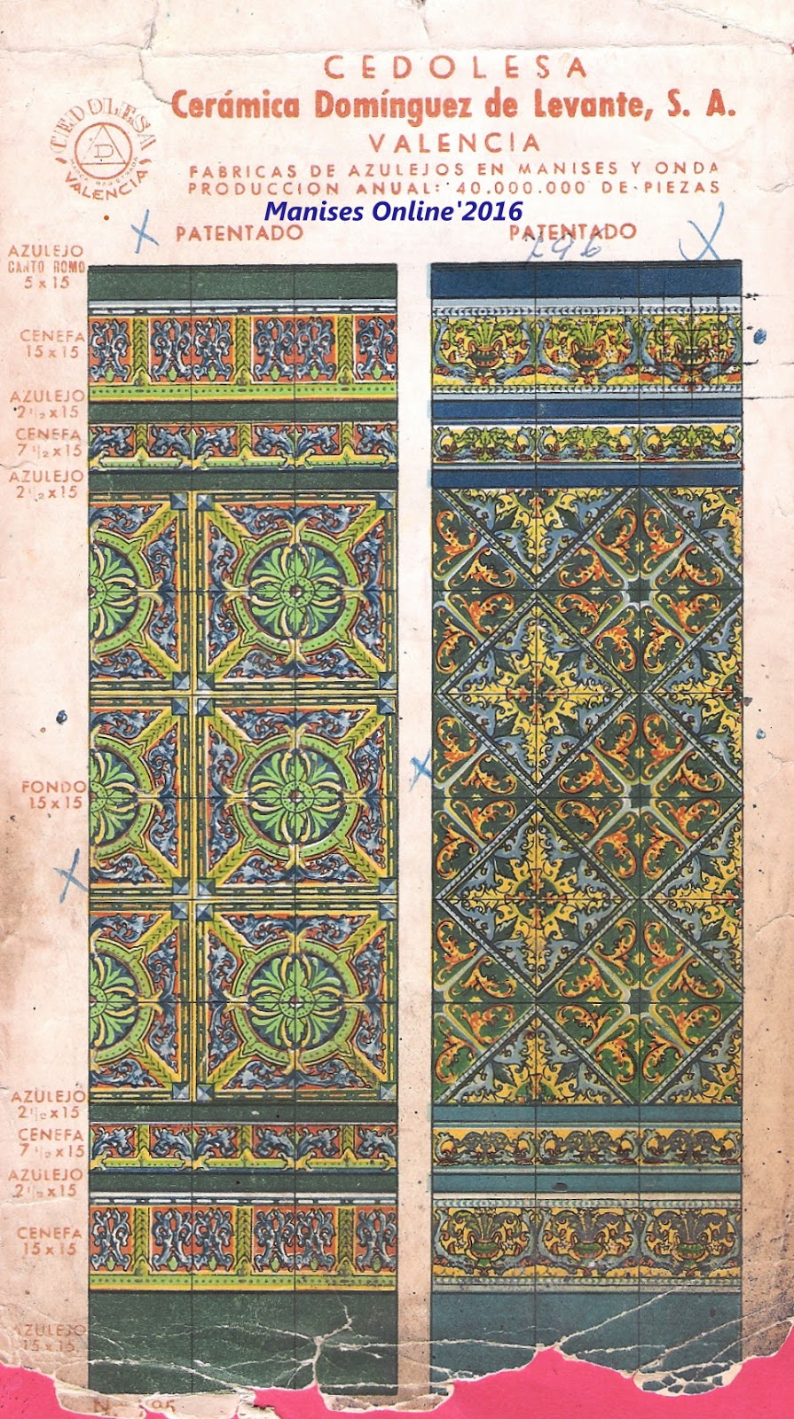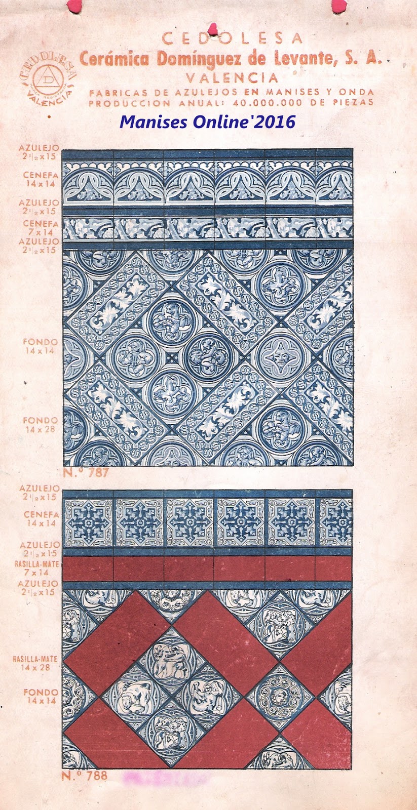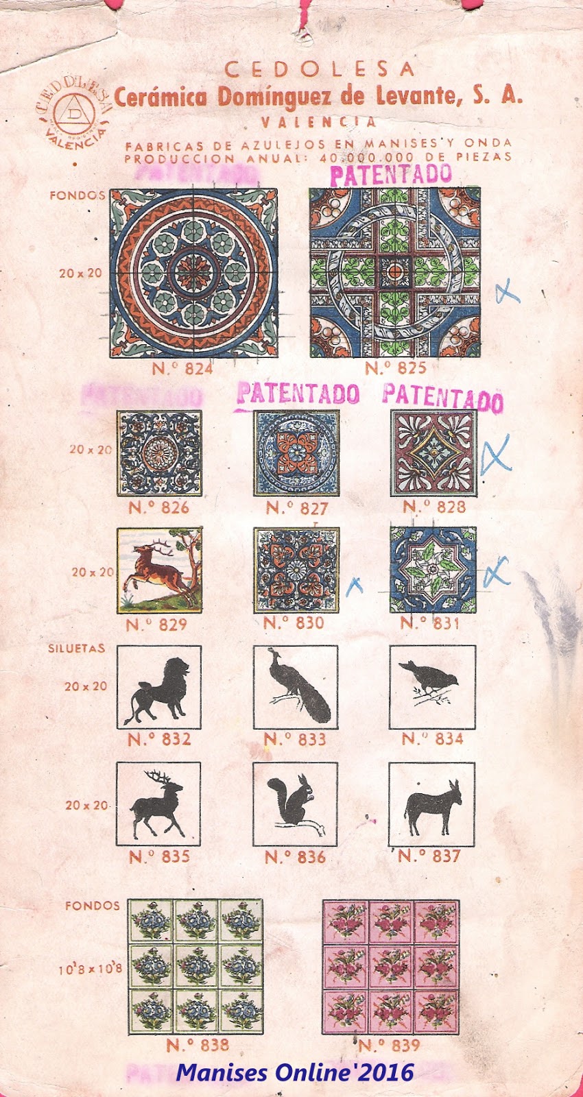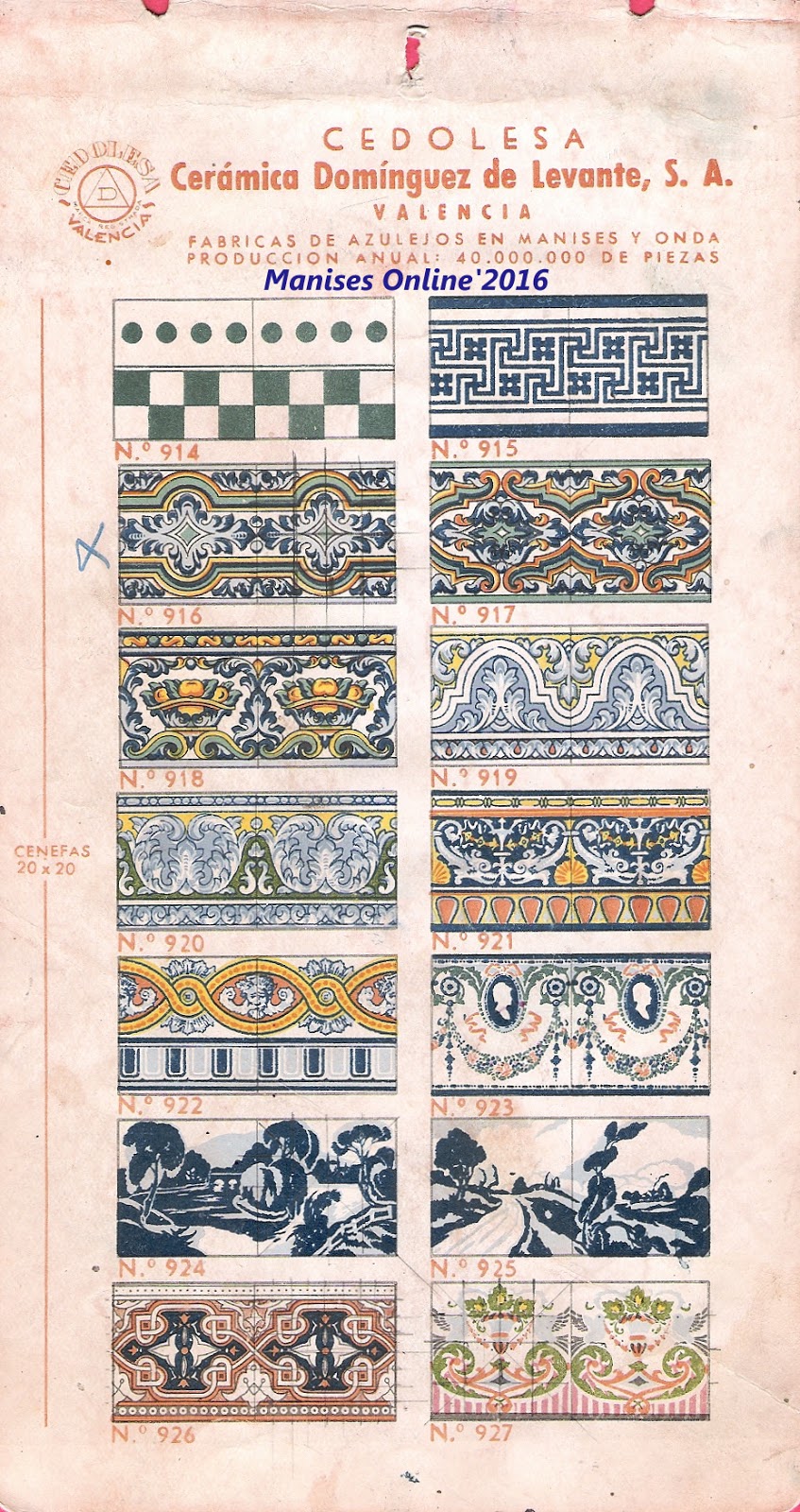 En este catálogo publicado posteriormente nos encontramos con una visión distinta, ya que en sus láminas se especifica que -además de las fábricas de Manises y Onda- se incluye que se fabrican 40.000.000 millones de piezas, es decir 20 millones más que cuando se hizo el catálogo anterior.