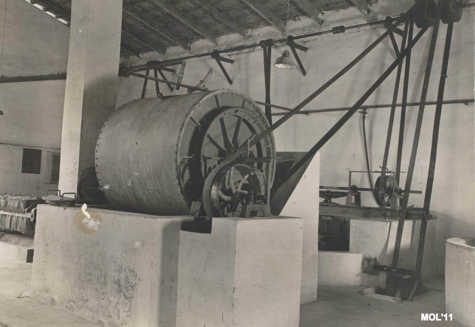 La maquinaria per a fer barro -com es pot vore- consistia en una pastaora ( com les que tenien els forners, que dins hi havien unes pales per a remenejar el barro o fanc ) i que poc a poc, quan estava en saó, es treya i ya estava a punt per a treballar en ell. Damunt del banc -a l’esquerra ( darrere de l’operari dret )- es pot vore el barro amontonat i preparat per a poder-lo gastar. Este fanc es posava en els moles, i per mig de la prensa se li donava forma a la peça, que apareix -en terra- en els moles. Al poc de temps, i secant-se pel seu propi mig ( a temperatura ambient ) es traïa del mole per a que poc a poc anara secant-se.