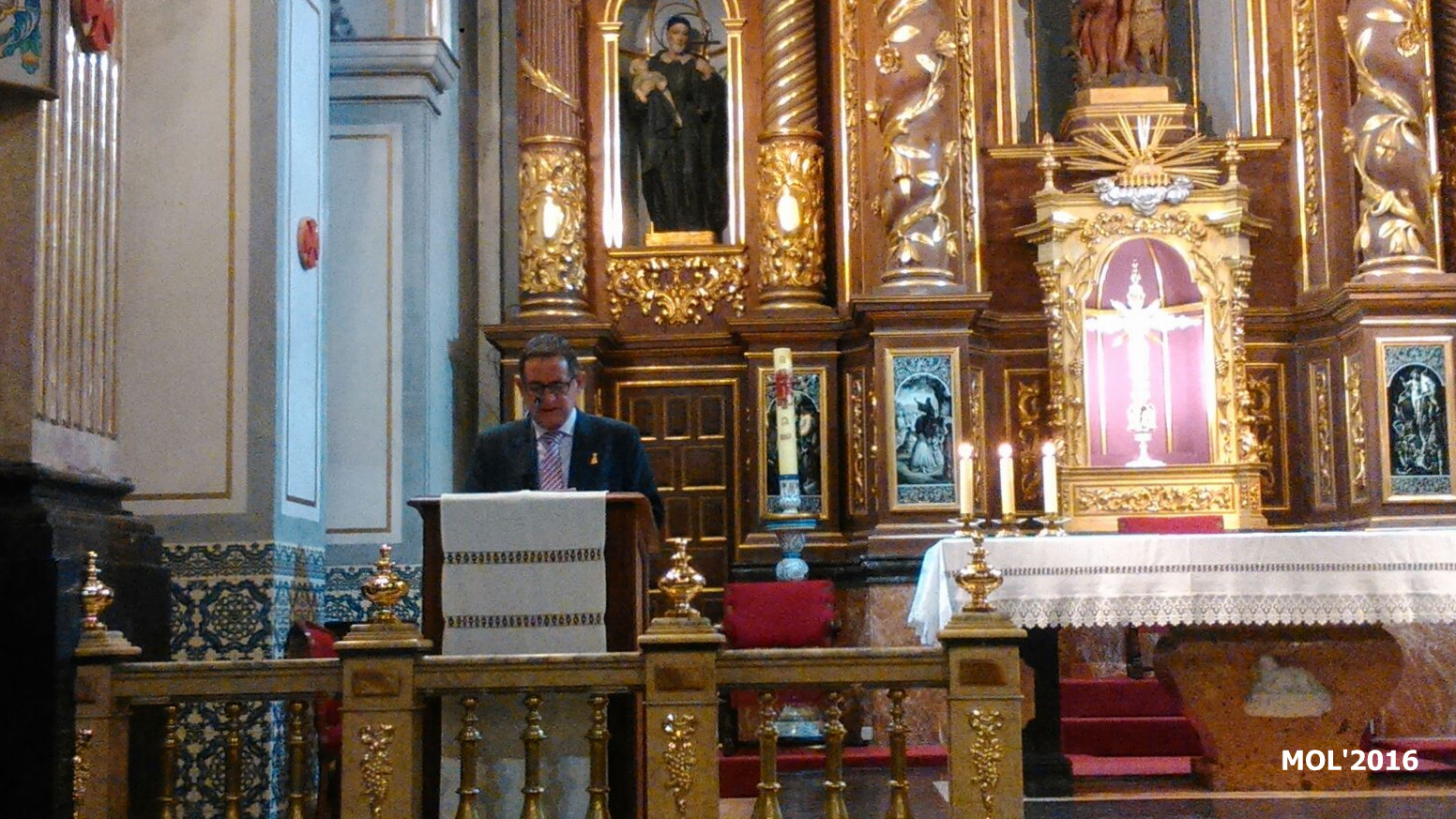 La Virgen presidiendo la celebración se encontraba en la parte derecha del altar mayor (mirando de frente al mismo) y en el desarrollo de la Santa Misa, celebrada por el Cura Párroco, han participado los diversos componentes de la Clavaría: Introducción, Lecturas, Preces y Ofrendas.