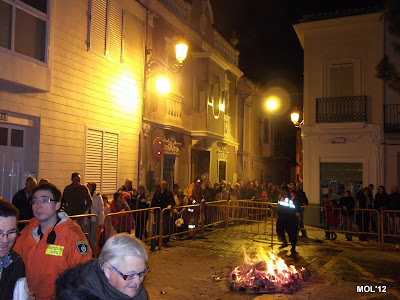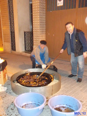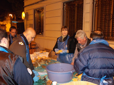 Imagen a las 19:00 horas, de la hoguera. A continuación los clavarios preparando los bocadillos y el reparto de los mismos.