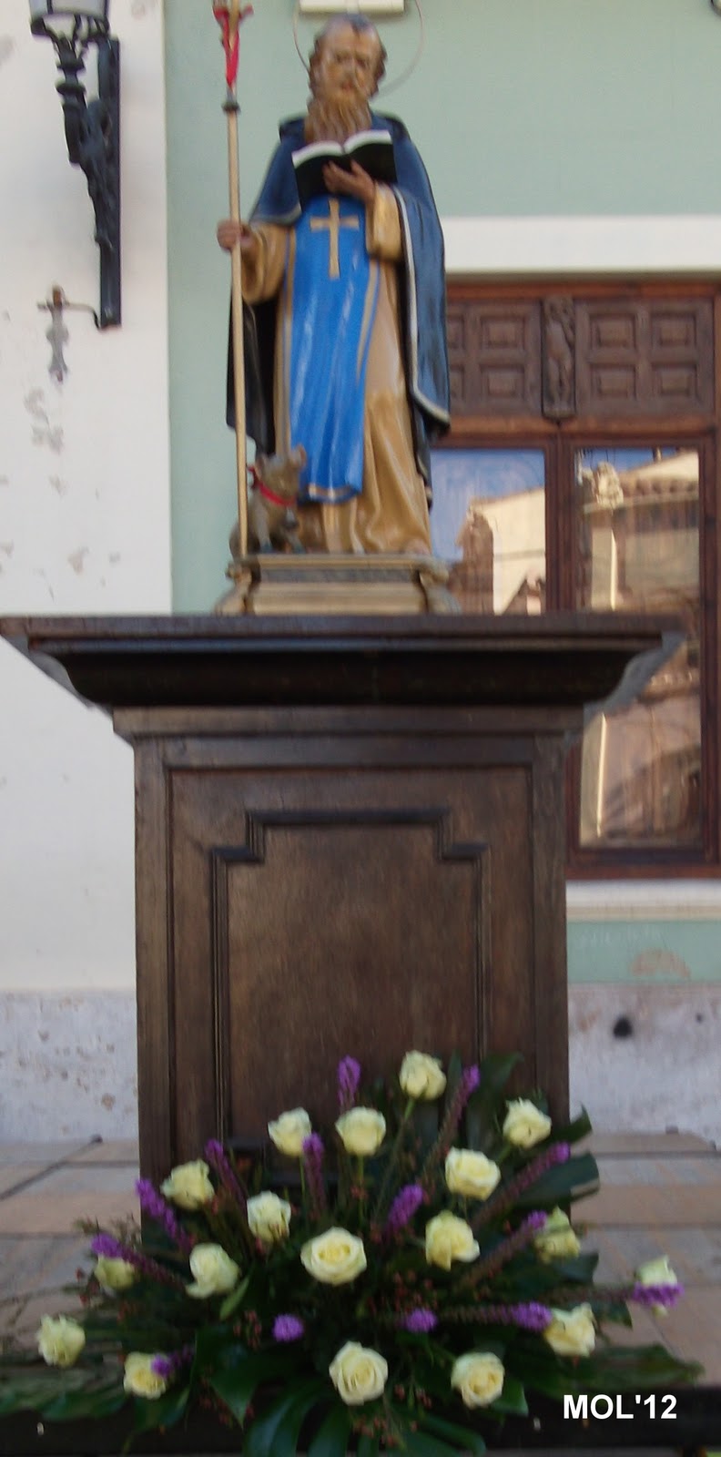 Imagen del santo en la peana instalada en el Paseo Guillermo de Osma de Manises, lugar donde ha tenido lugar la bendición de animales domésticos y caballerías.