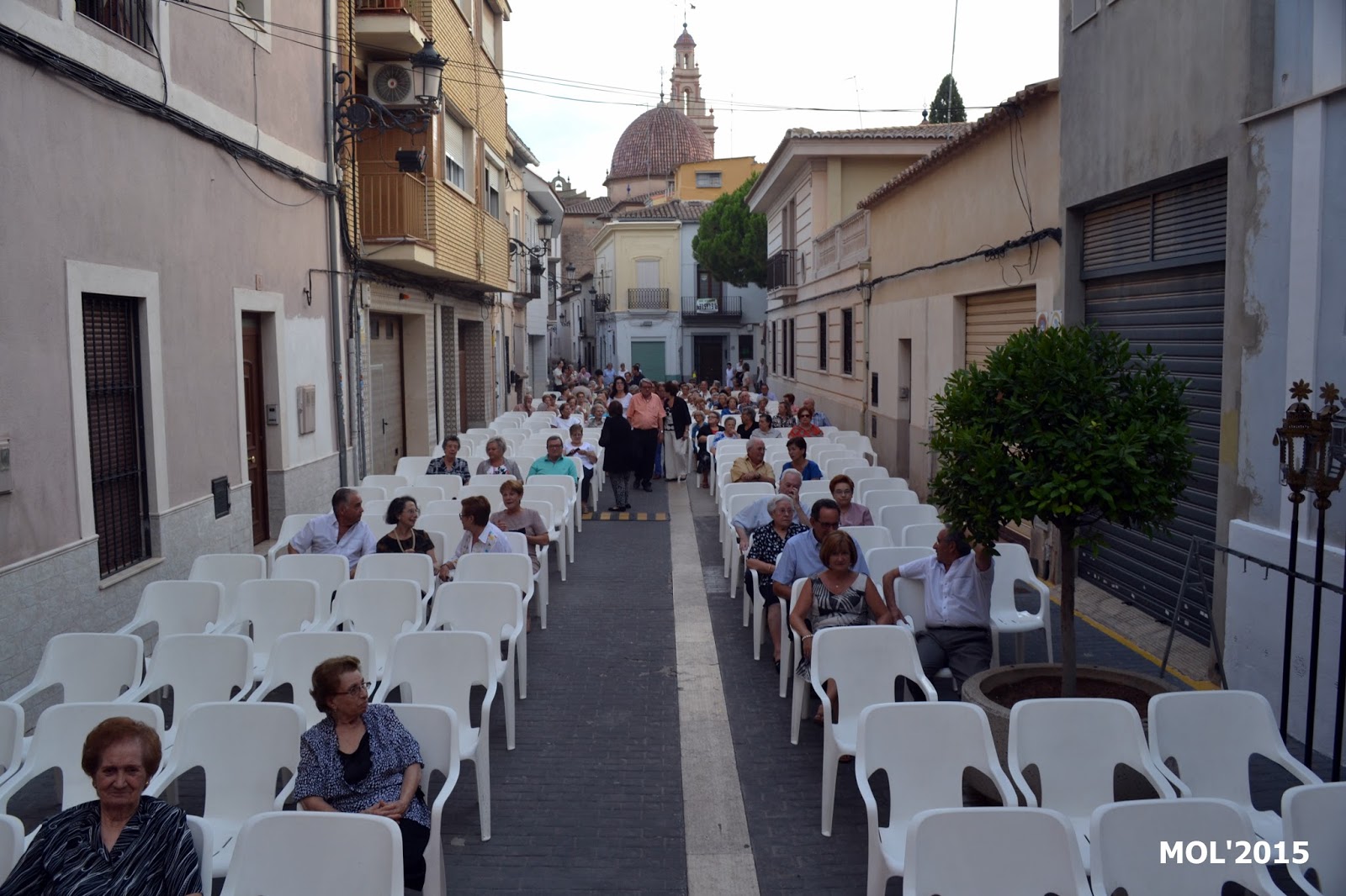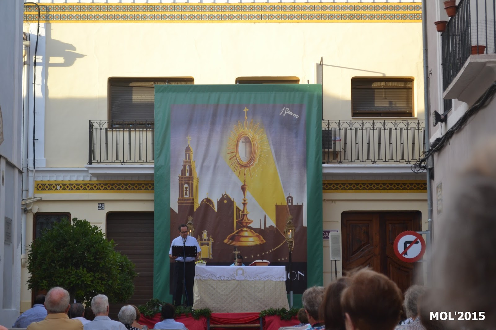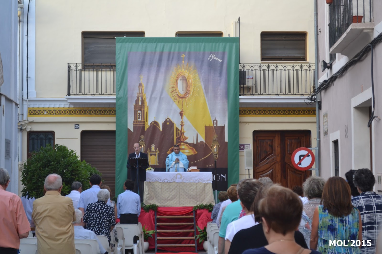 En este escenario que se puede ver, teniendo como fondo el tapiz pintado por el insigne ceramista José Gimeno Martínez, de La Cerámica Valenciana, y el altar preparado para la ocasión, es donde antiguamente estaba ubicada la antigua Iglesia de San Juan Bautista (que no siempre tuvo este nombre, ya que en diversas épocas se le cambió). También formaba parte de la Iglesia la calle de Mossen Pere Esplugues y calles adyacentes como la calle del Sagrario. Todo ello fue derruido por su mal estado y en su lugar se construyó la nueva Parroquia de San Juan Bautista.