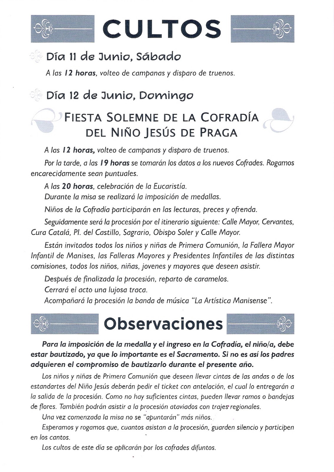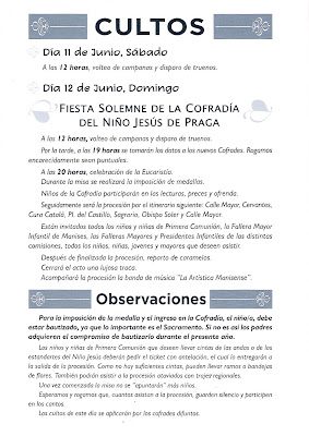 Tal y como estaba anunciado, en el programa que se muestra, la Cofradía del Niño Jesús de Praga de la Parroquia de San Juan Bautista de Manises, ha celebrado una solemne Misa y una concurridísima procesión por las calles de Manises, ciñéndose a las establecidas y que entran dentro del término de la Parroquia.
