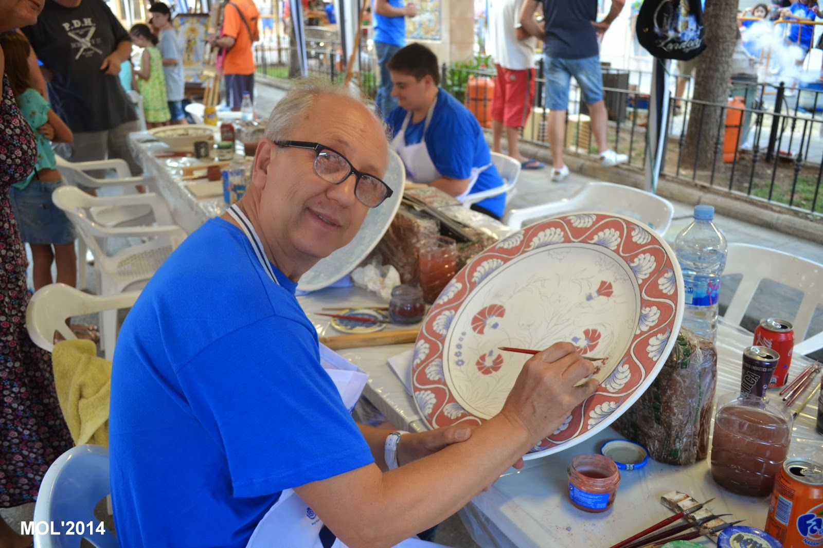 Francisco Álvarez Verde, pintando y mostrando el tipo de cerámica que ofrece, como son els socarrats del siglo XV y barroco valenciano del siglo XVIII, los heráldicos o murales.