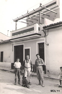 En el momento del almuerzo, delante del edificio que estaban pintando. El de la izquierda ( el moreno ) es Antonio Segura. La fecha de la fotografía es el 14 de Julio de 1953.
