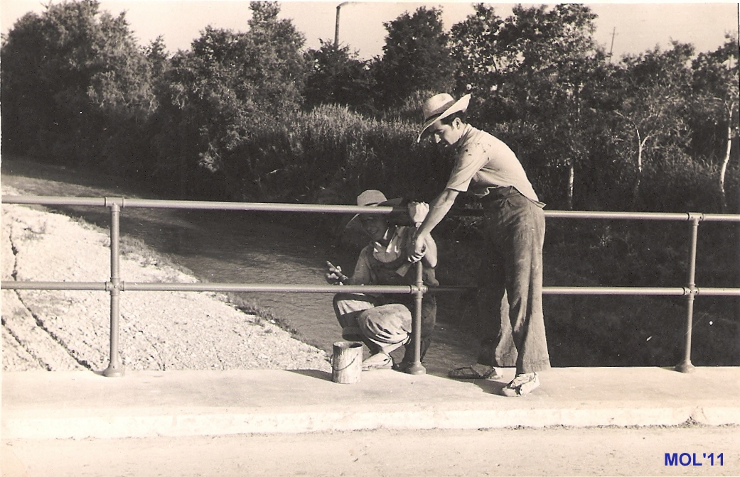 Antonio pintando la barandilla de lo que era el Puente de Manises a Paterna. El río Turia llevaba más agua que ahora. Fotografía tomada el 1 de Agosto de 1954.