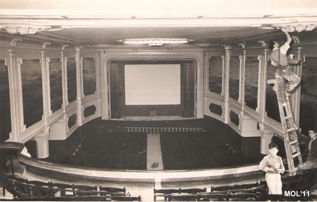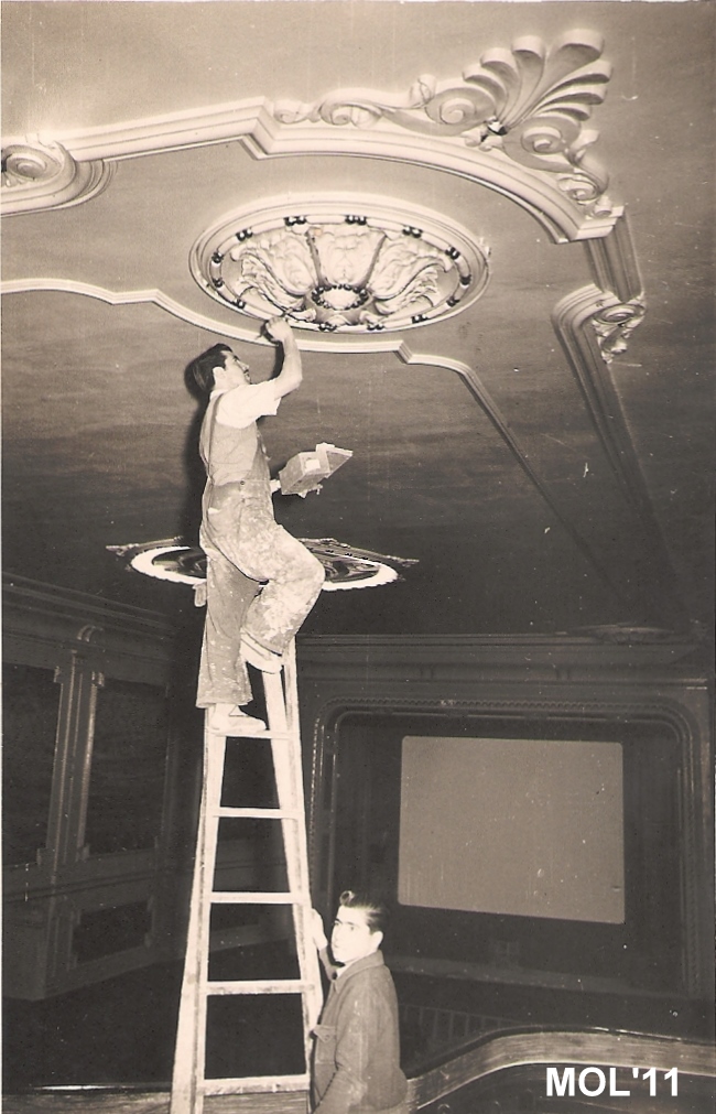 Ref. 04. Fotógrafo Gadea. Desde el patio de butacas Antonio pintando las paredes y la escayola que decoraba el cine. Al fondo la » casola «. Fotografía tomada el 25 de Noviembre de 1953.