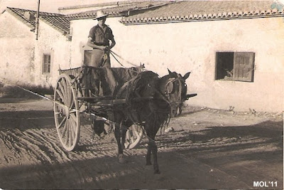 Típica estampa de la Manises de los años 1950. Antonio Segura con su medio de transporte, el carro.