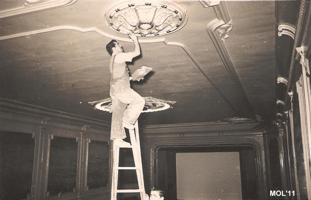 Ref. 05. Fotógrafo Gadea. Antonio pintando el techo con las escayolas de adorno que tenía el cine. Fotografía tomada el 25 de Noviembre de 1953.
