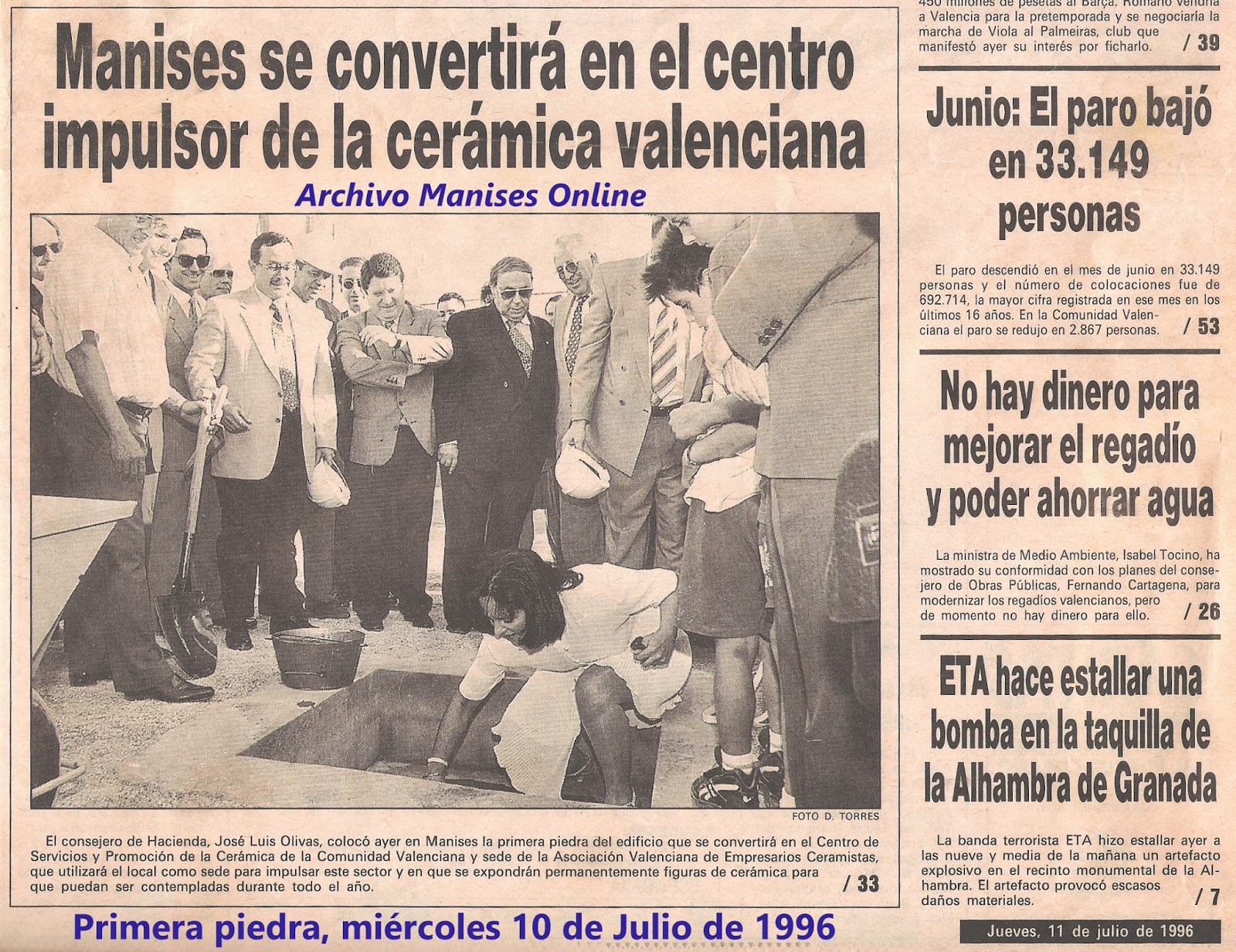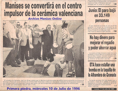 Noticia de la colocación de la primera piedra de este edificio que tuvo lugar el miércoles 10 de julio de 1996, siendo Alcalde de Manises José Alberto Arnal.