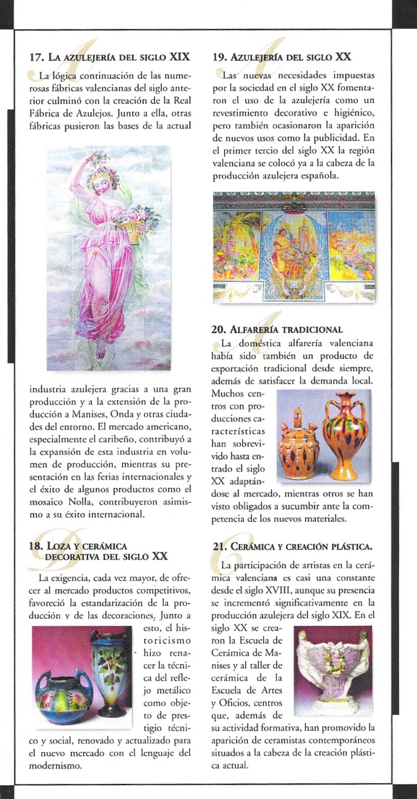 Con el fin de que tengan una idea del contenido de este completo trabajo, les relaciono los 21 capítulos donde se recoge la Historia de la Cerámica Valenciana, sus orígenes y proyección hasta nuestros días.