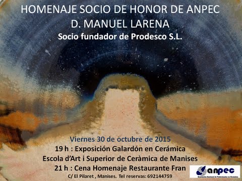 Finalizado el homenaje en la Escuela de Cerámica nos dirigimos a un restaurante de Manises donde tuvo lugar una cena en su honor y en la que se brindó por su persona, por su labor desarrollada a lo largo de todos estos años y por el 50 aniversario de la fundación de Prodesco, S.L., empresa a la que todos le deseamos los máximos éxitos, y otros-como mínimo- 50 años más.