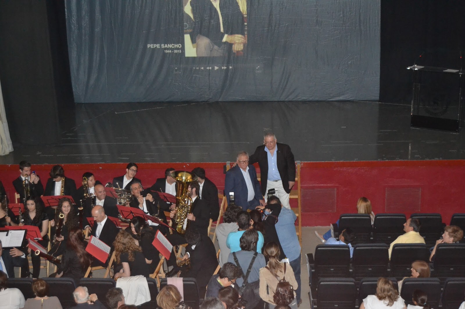 Cartel con la fotografía de Pepe Sancho que se encontraba en el vestíbulo del Auditorio. Sus hermanos: Luis a la izquierda y Rafael a la derecha. Foto de Pepe Esteve.
